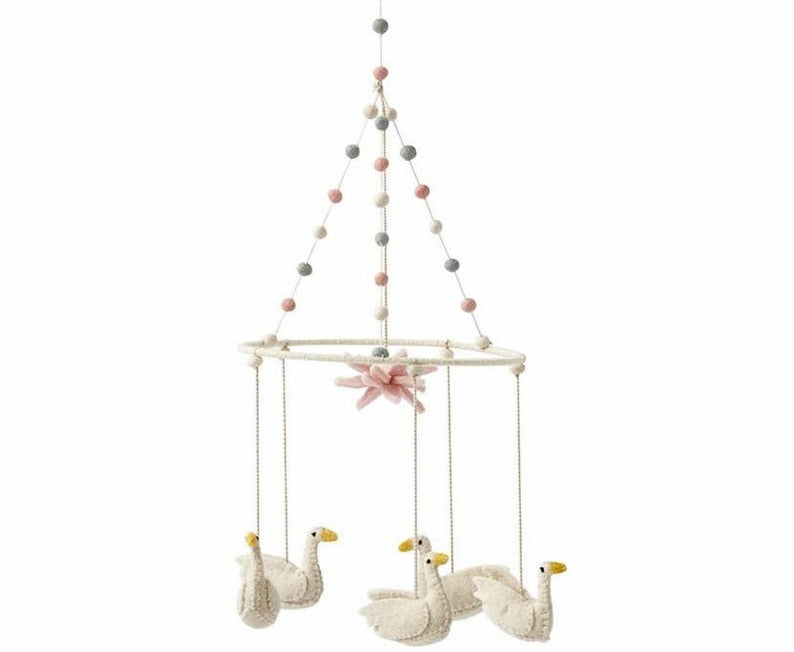 Each mobile creature and pom pom detail is hand crafted with 100% wool felt making each mobile special and unique. Pehr's mobiles come in a gift box for safe keeping and to be passed down for future generations.