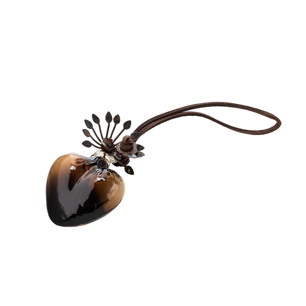 Adelita is a mouth-blown glass bathed in chocolate, rich in color and texture. On a leather cord Adelita can be hung from a tree, a door knob, and even on the wall. Wherever you drape her, she'll send blessings of light to all who visit!