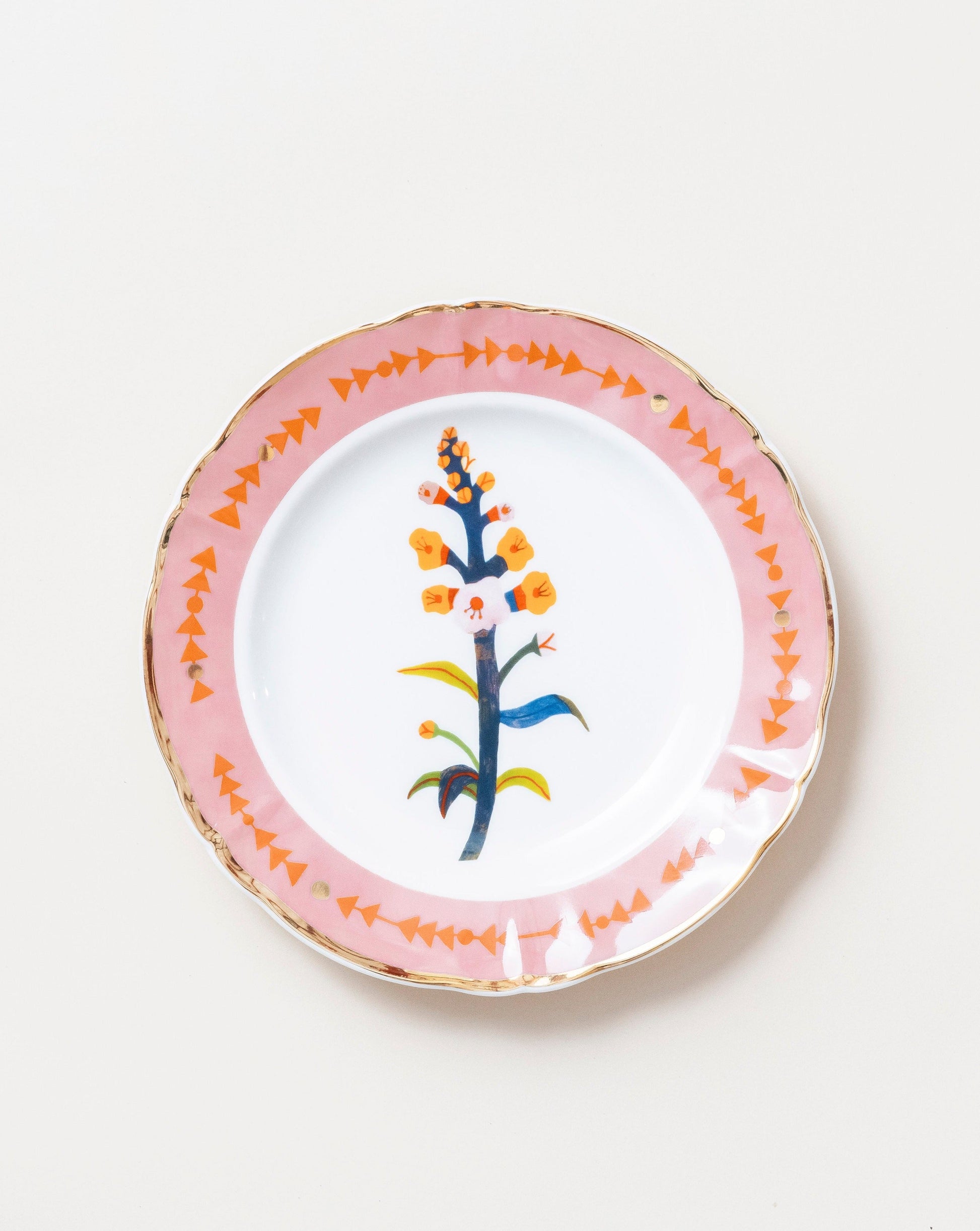 A pink dessert plate by Bitossi with a simple blooming flower at the centre and a pink decorated border, finished with a gold rim. All it's missing is a slice of tart/cake/pie/ [delete as appropriate]