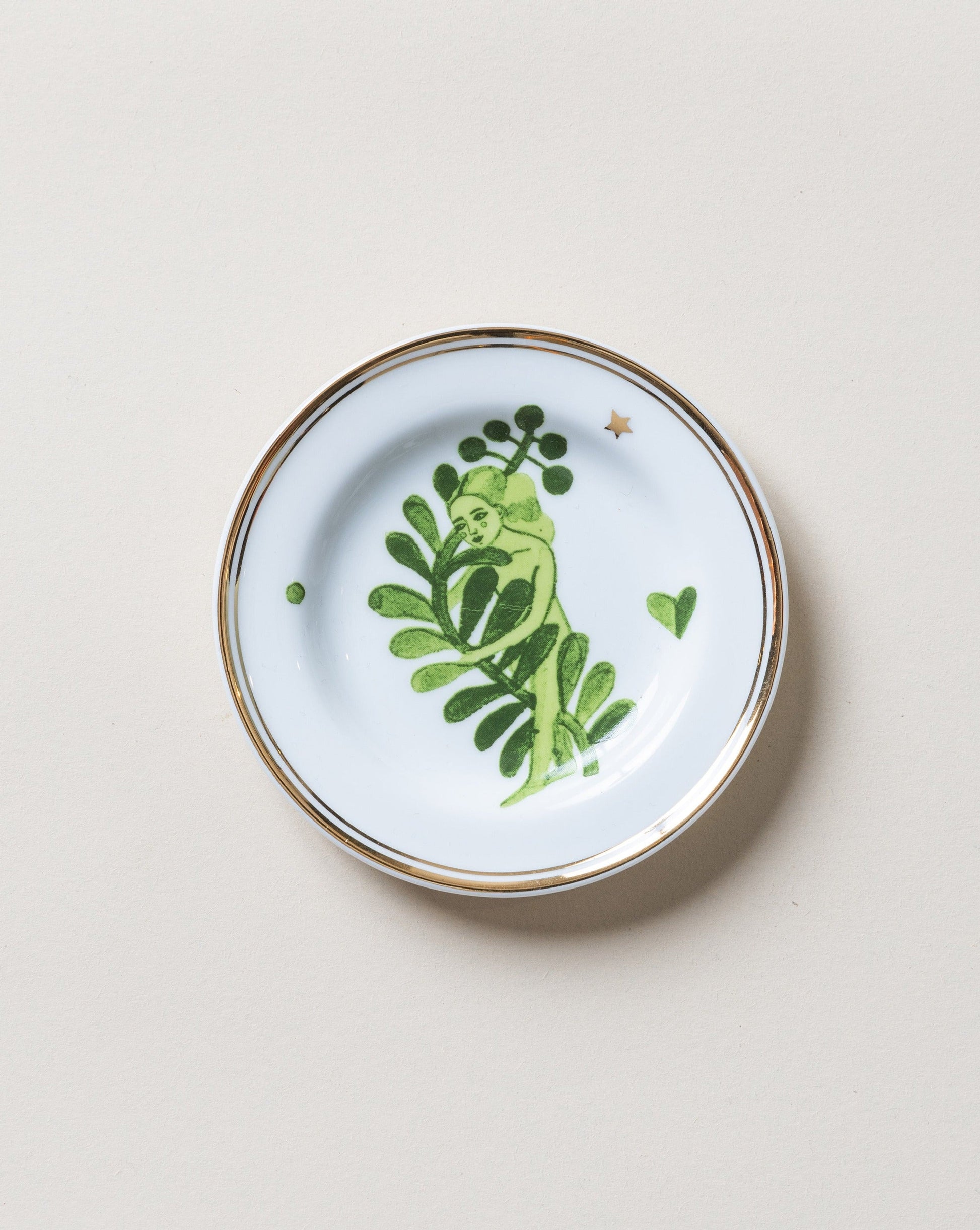 The sweetest little gold-rimmed white plate from Bitossi finished with a woman figure and green branch printed in the centre. Use if for that afternoon biscuit alongside your tea, a slice or two of cheese with your cracker of choice, or any little snack that just needs a little plate!