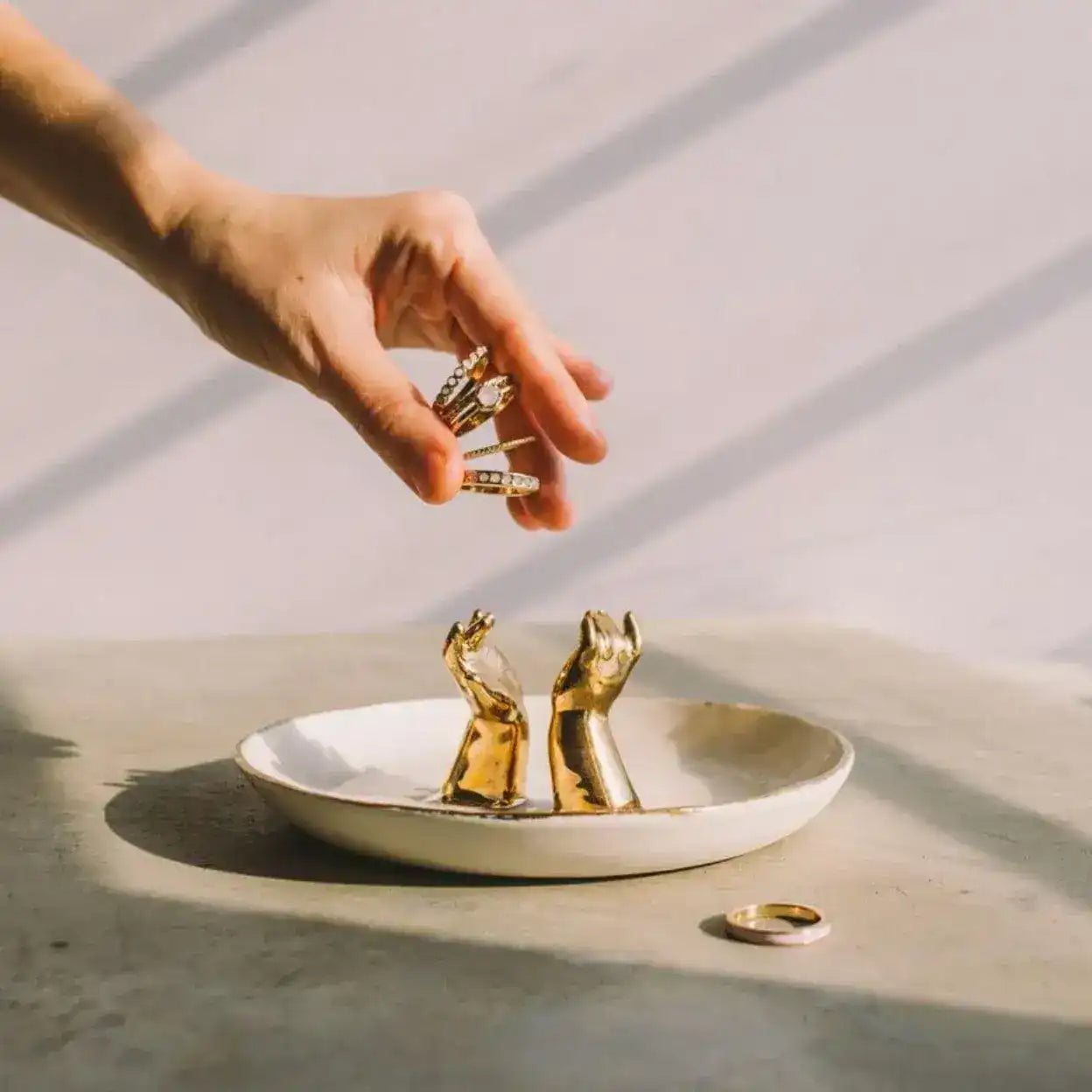 Whether placed on your office desk to hold paper clips and pins or set on your nightstand as a home for your little treasures, this whimsical catch-all garnished with sculptural golden hands is as delightful as it is functional.