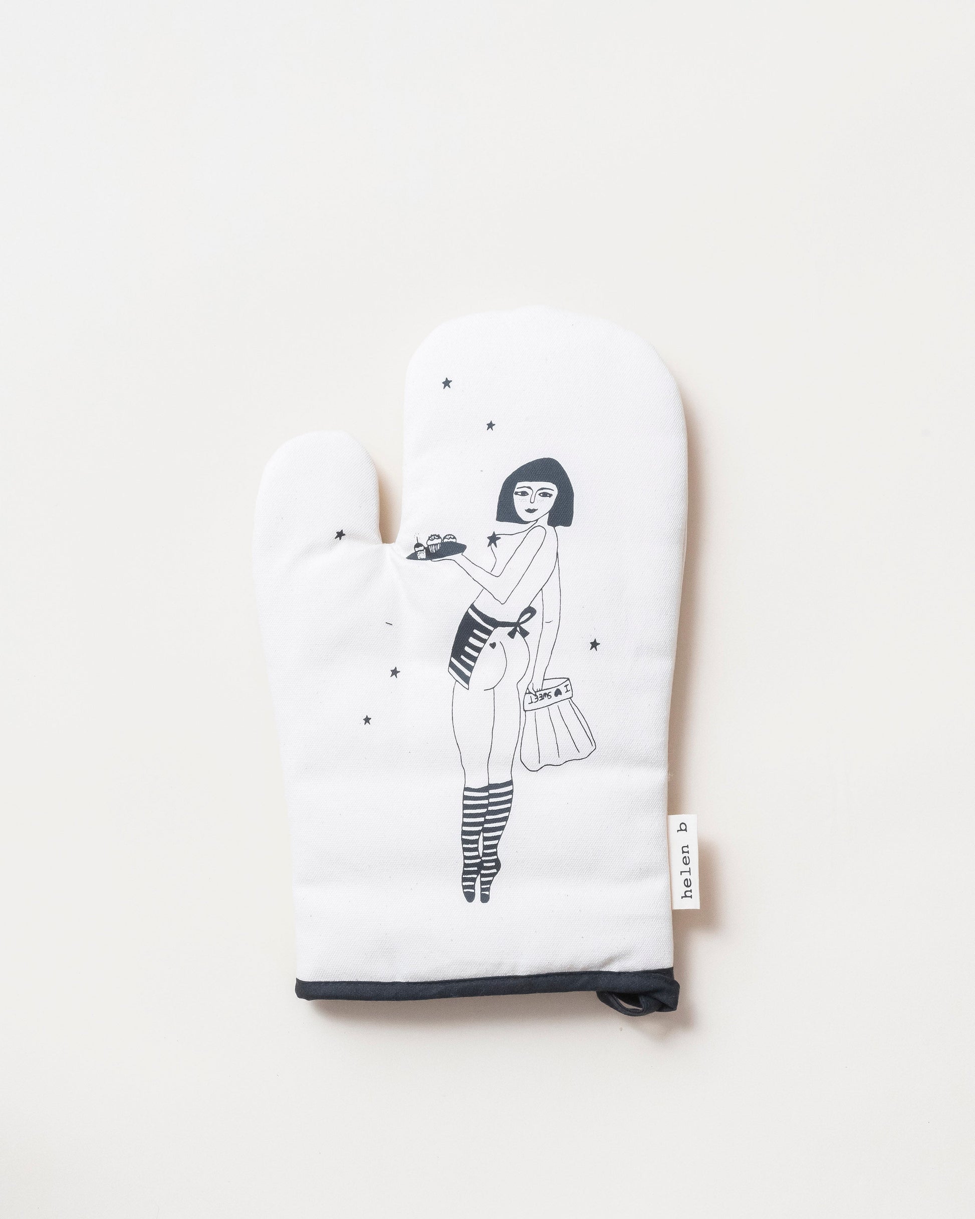 Stay safe with Helen B's oven glove finished with one of her signature illustrations of a pin-up cake girl, wearing nothing but an apron and a pair of stripy socks! A fun and cheeky gift or just to add to your own kitchen.