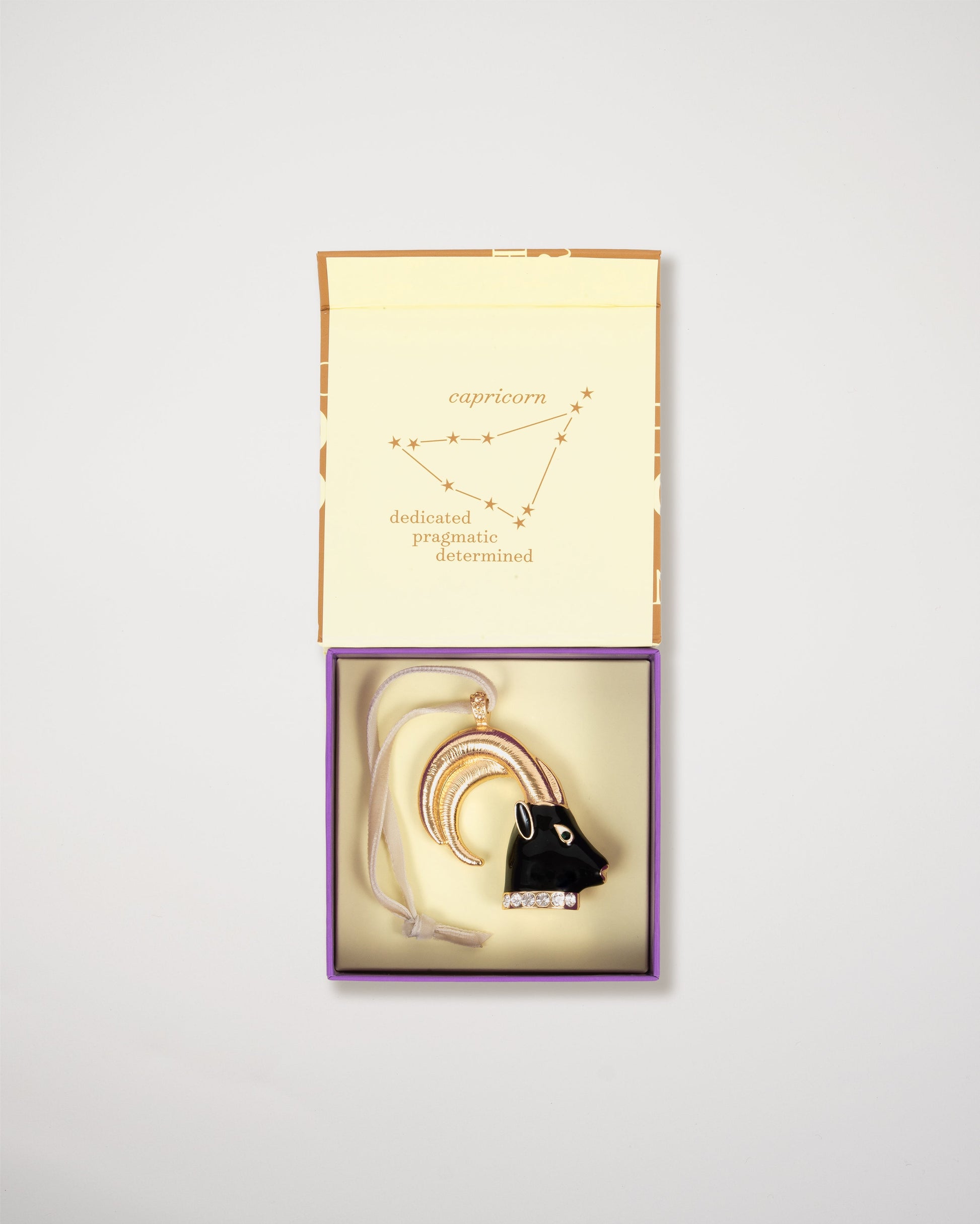 A beautiful hanging capricorn ornament that would make the most wonderful gift. The box comes with a little astrological description of an capricorn all tied up with a velvet ribbon.