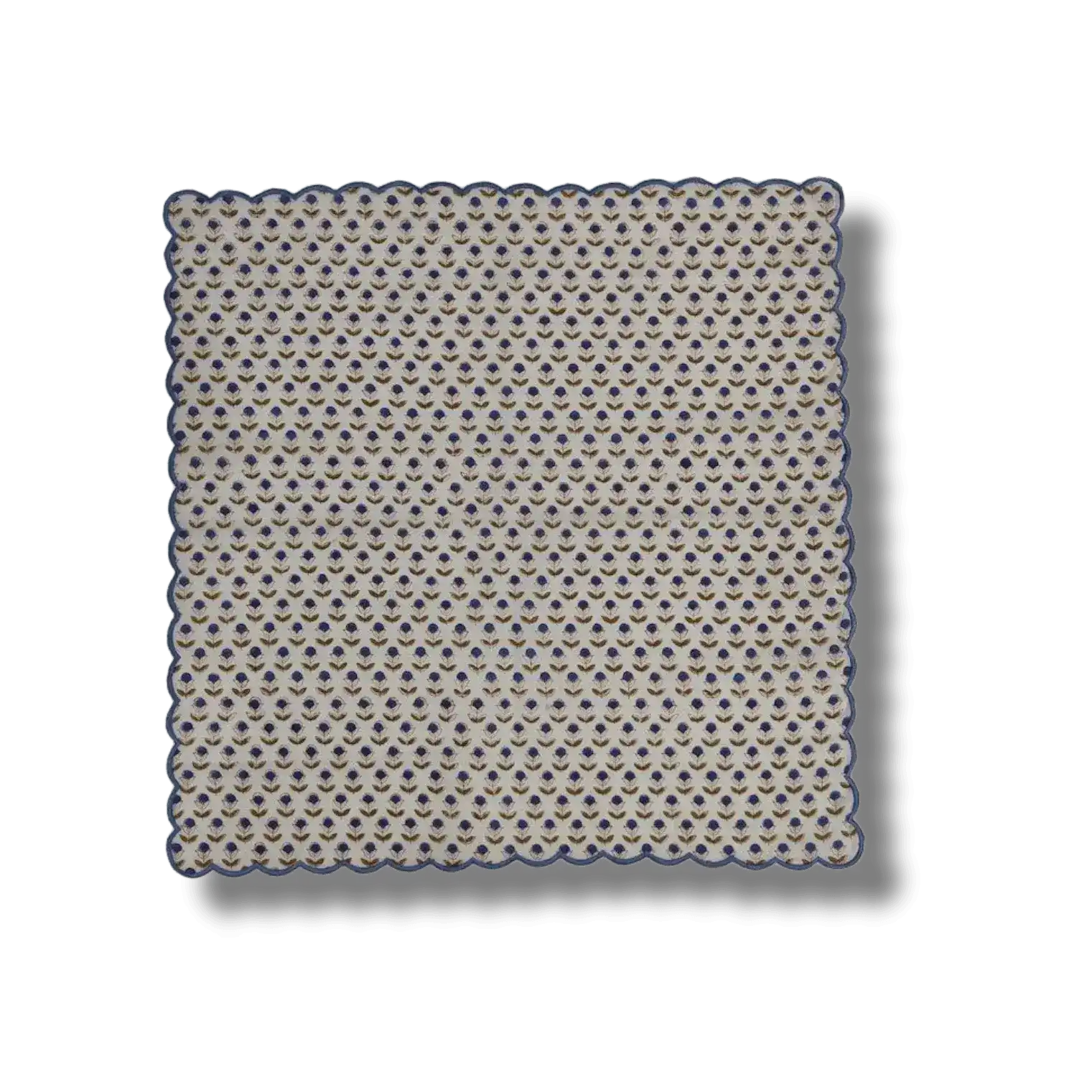 A hand block printed embroidered delight! These Mini Scallop Denim Blue Cotton Napkins are sold in a set of your choices and handmade from 100% cotton fabric. Print and Embroidery Scallop Using reusable cloth napkins of any size is a great way to reduce store-bought paper napkin usage and help our earth, sustainably.