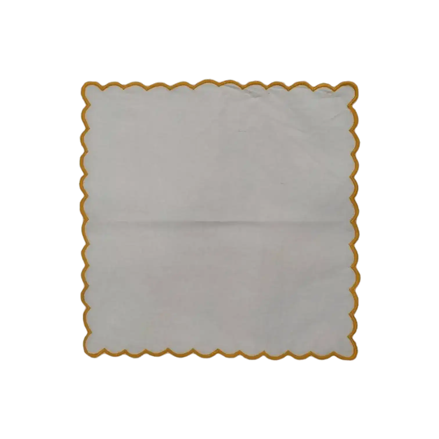 - Our Mini Scalloped White Cotton Napkins with Embroidered Trim are for everyday reusable use, casual dining, or would make a lovely gift! The napkins are pre-washed, have Piping corners, and are ready for use.