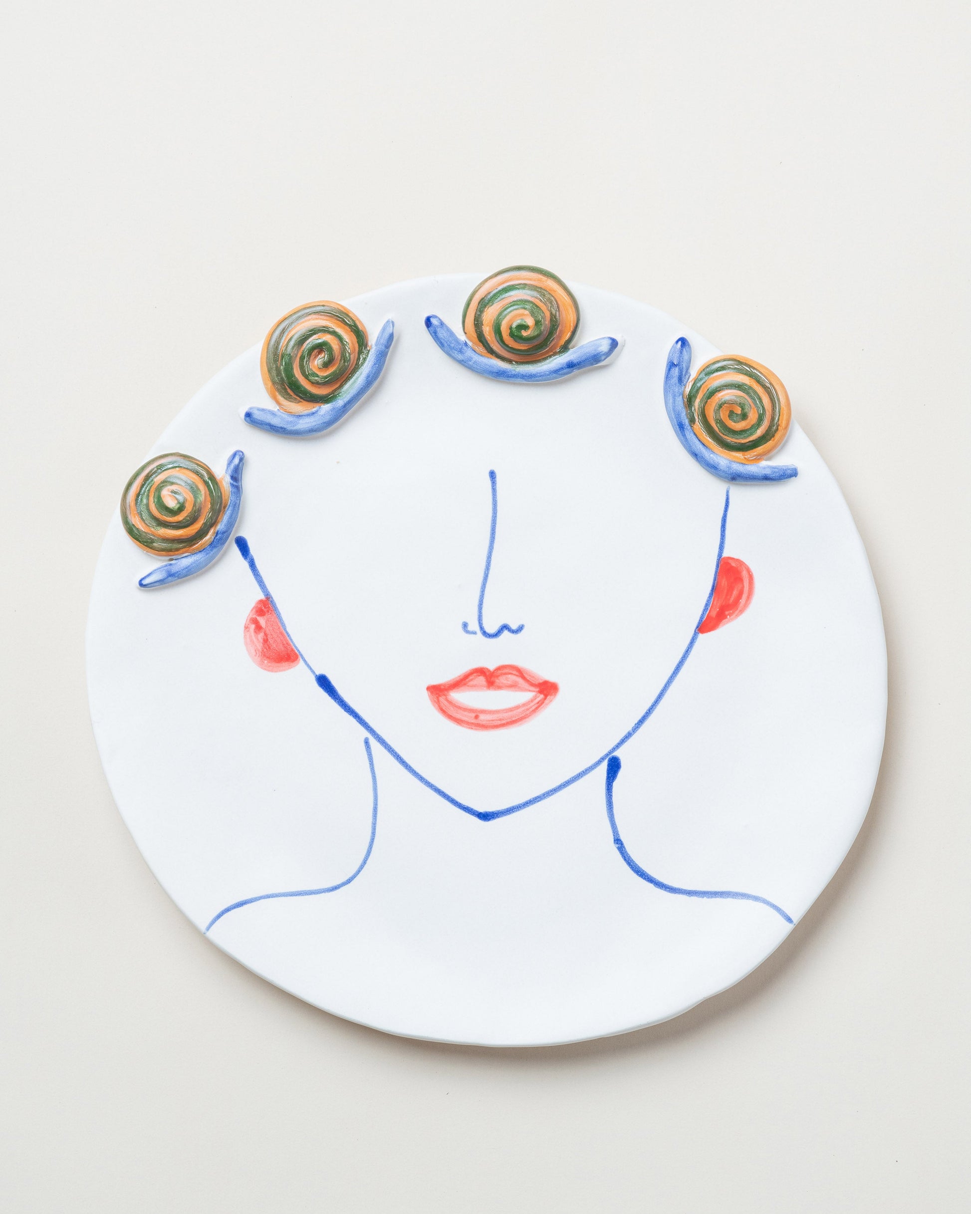 The artistic and playful flair of Patrizia Italiano is shown through this white plate, finished with a simple blue brushstroke of a person's head and adorned with a crown of 4 ceramic snails. Use it to add some fun to your dinner table or display it as a standalone piece of art.