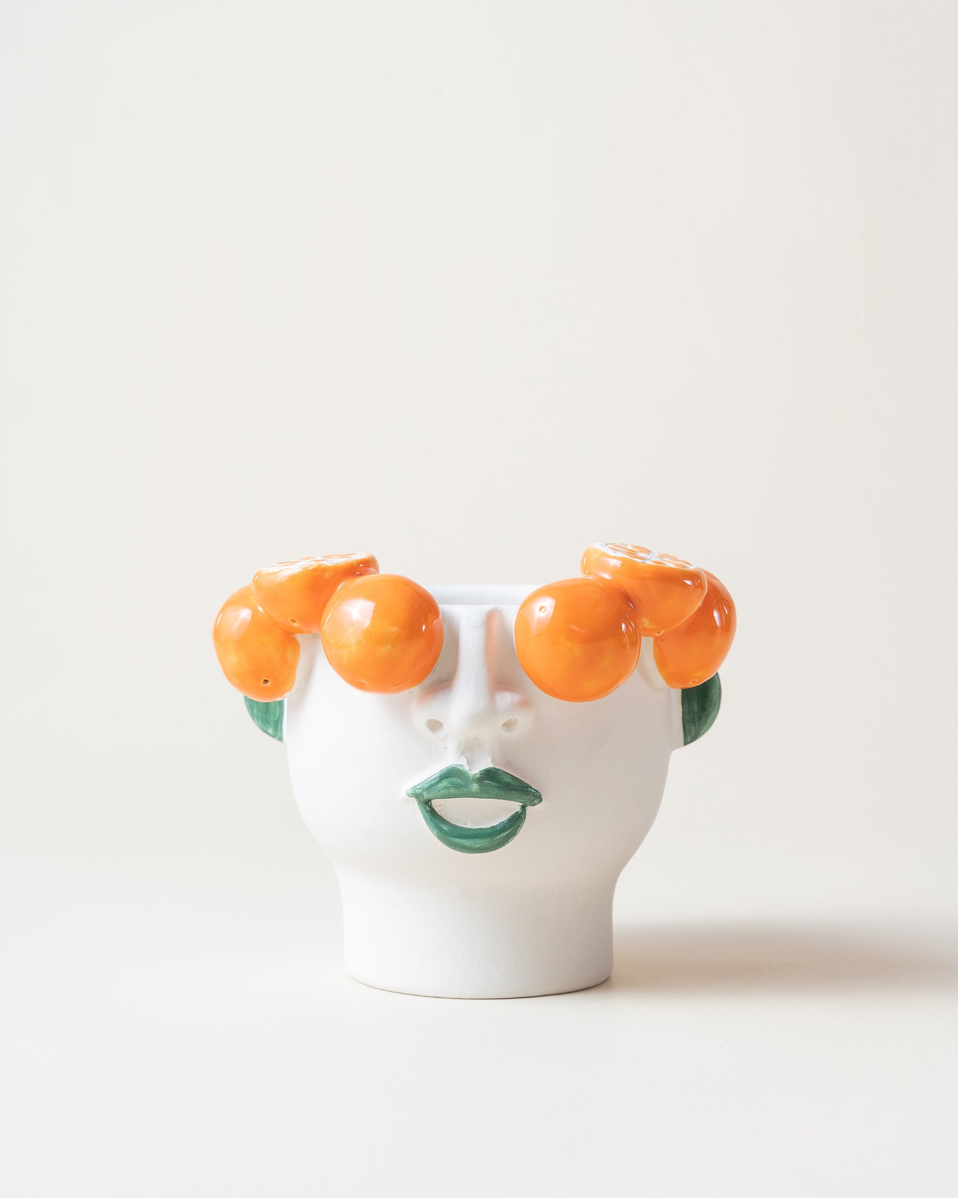 The beauty of Sicily is celebrated with this wonderful white vase by Patrizia Italiano. Adorned with a crown of brightly coloured oranges. A great piece of art in it's own right, or use it to display flowers or hold an abundance of fruit!