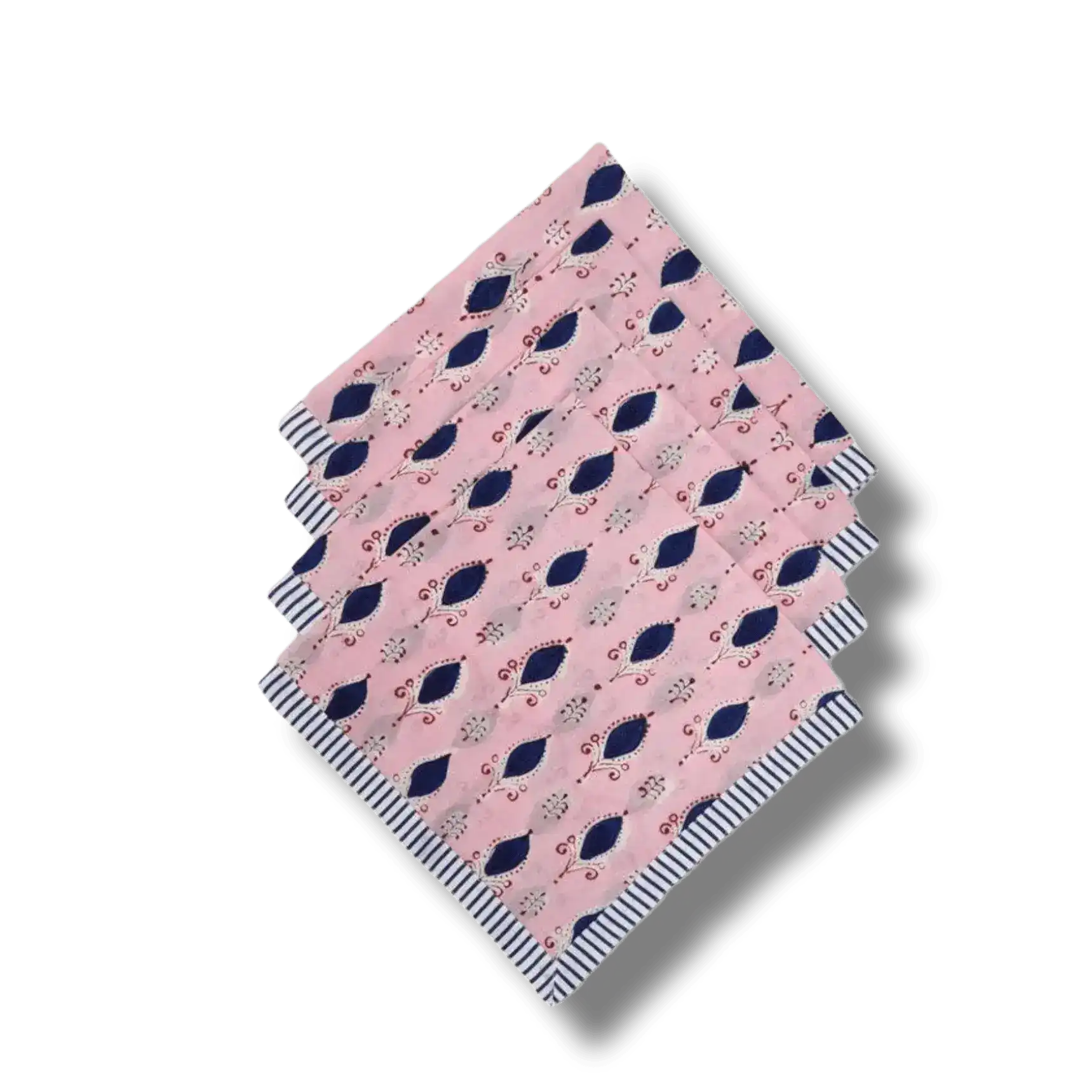 - A garden color delight! Pink Floral Indian Block Printed Striped Napkins are cute and colorful featuring green flowers on natural fabric napkins. These are sold in a set of 4 and handmade from 100% cotton fabric. Using reusable cloth napkins of any size is a great way to reduce store-bought paper napkin usage and help our earth, sustainably.