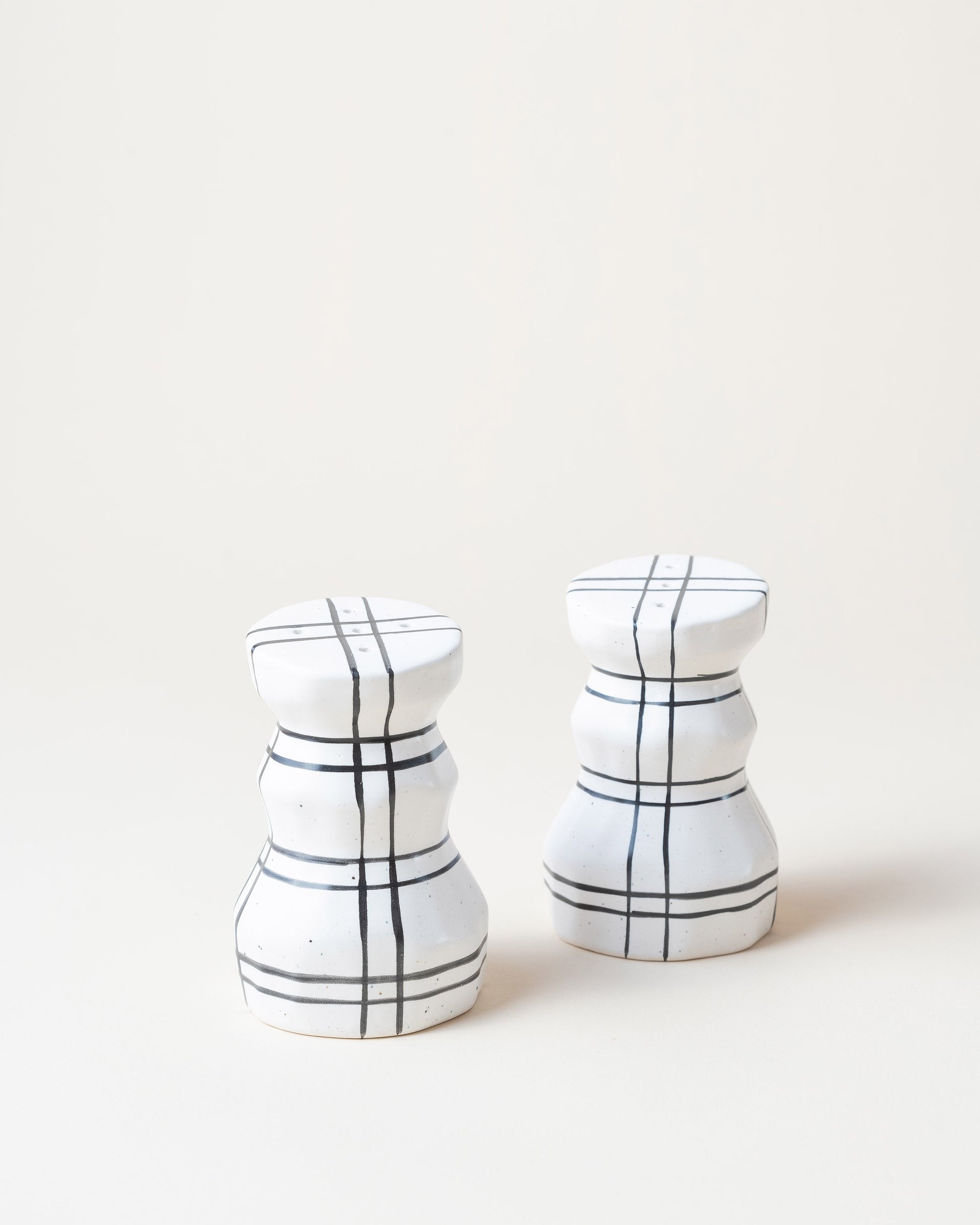 Make the basic act of seasoning your dinner a little more special with these salt & pepper shakers by Pó De Barro. Made to look rustic with it's handmade and distressed finish. It's decorated with fine black lines to create a fun chequered pattern.
