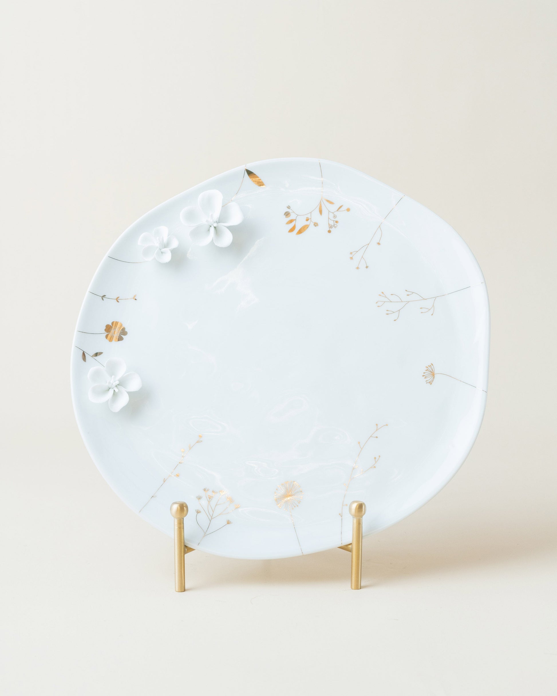 The perfect plate for your trinkets and treats from Raeder - this white porcelain plate, is adorned with three-dimensional flowers and gold hand-painted vines and flowers.