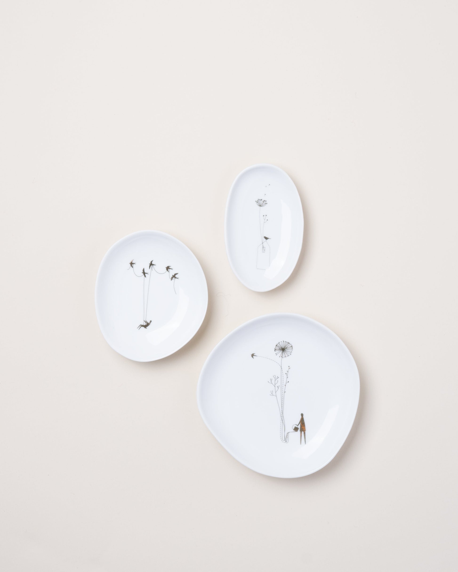 A delicate set of 3 porcelain bowls by Räeder. 3 wonderfully gold-foiled designs that celebrate nature, boasting delicate illustrations of dandelions. Ideal for keeping jewellery or trinkets safe or to display as they are!
