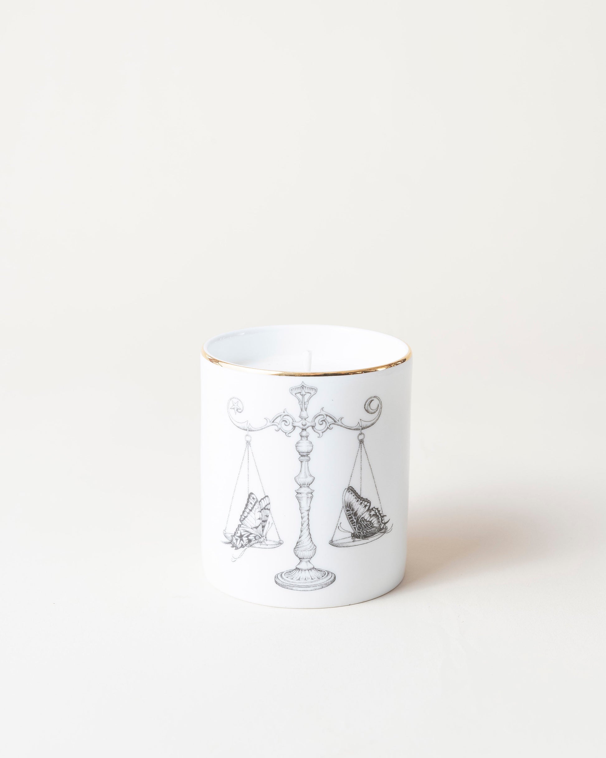 A wonderful scented candle by Rory Dobner in his signature fine bone china container. The libra zodiac sign is represented by Rory's intricate ink drawing of set of delicate scales with two little butterflies atop. Keep hold of them beyond the last burn and use the container as a sugar pot, a trinket pot, tea or coffee pot or as a piece of art in it's own right.