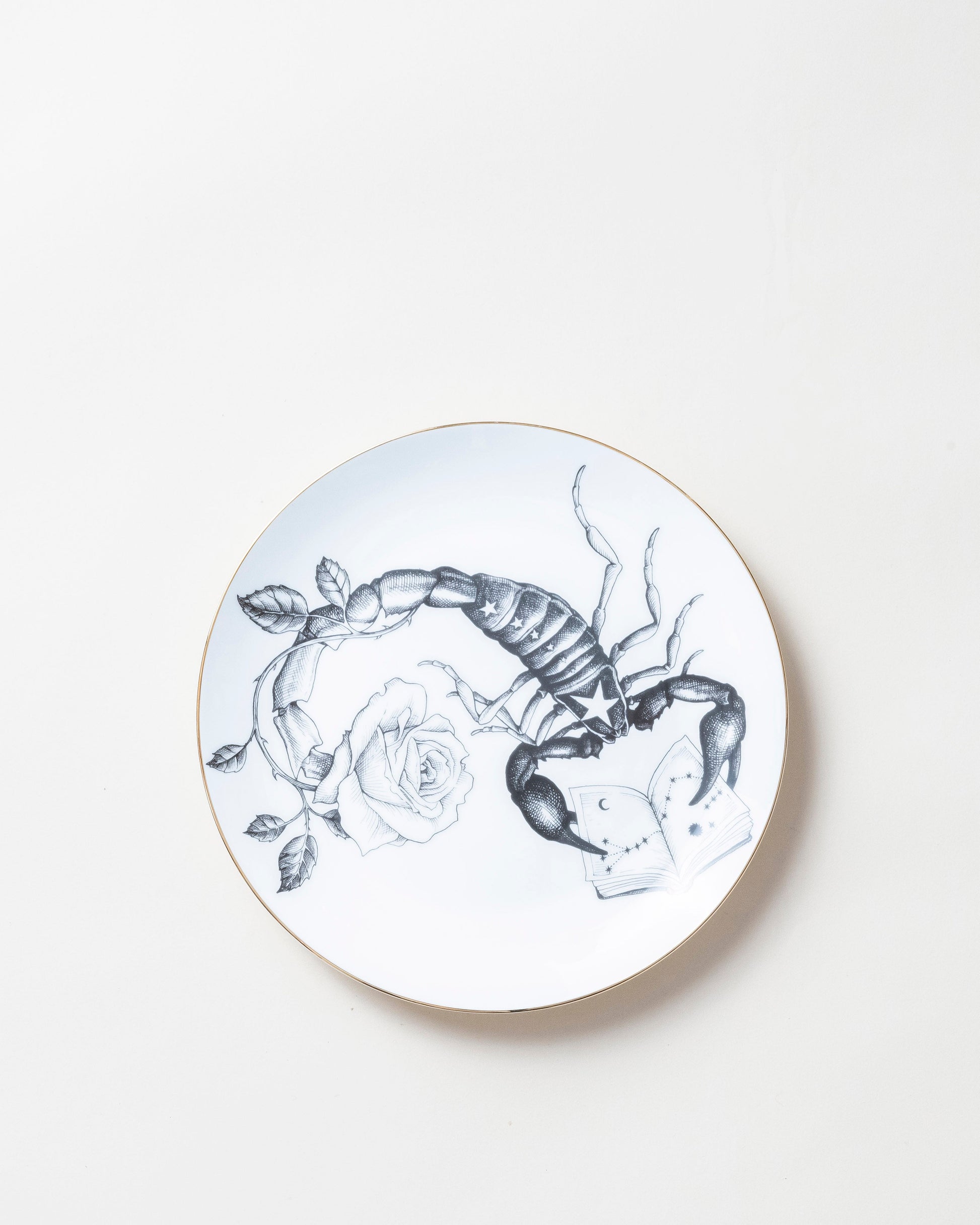 The scorpio zodiac is celebrated with the fine bone china plate by Rory Dobner - featuring an intricate illustration of a scorpio in his signature style along with a 22kt gold edged rim. The perfect gift for the scorpios in your life, to be used for long lunches, delicious dinners, or even to hang on the wall as a piece of art in it's own right.