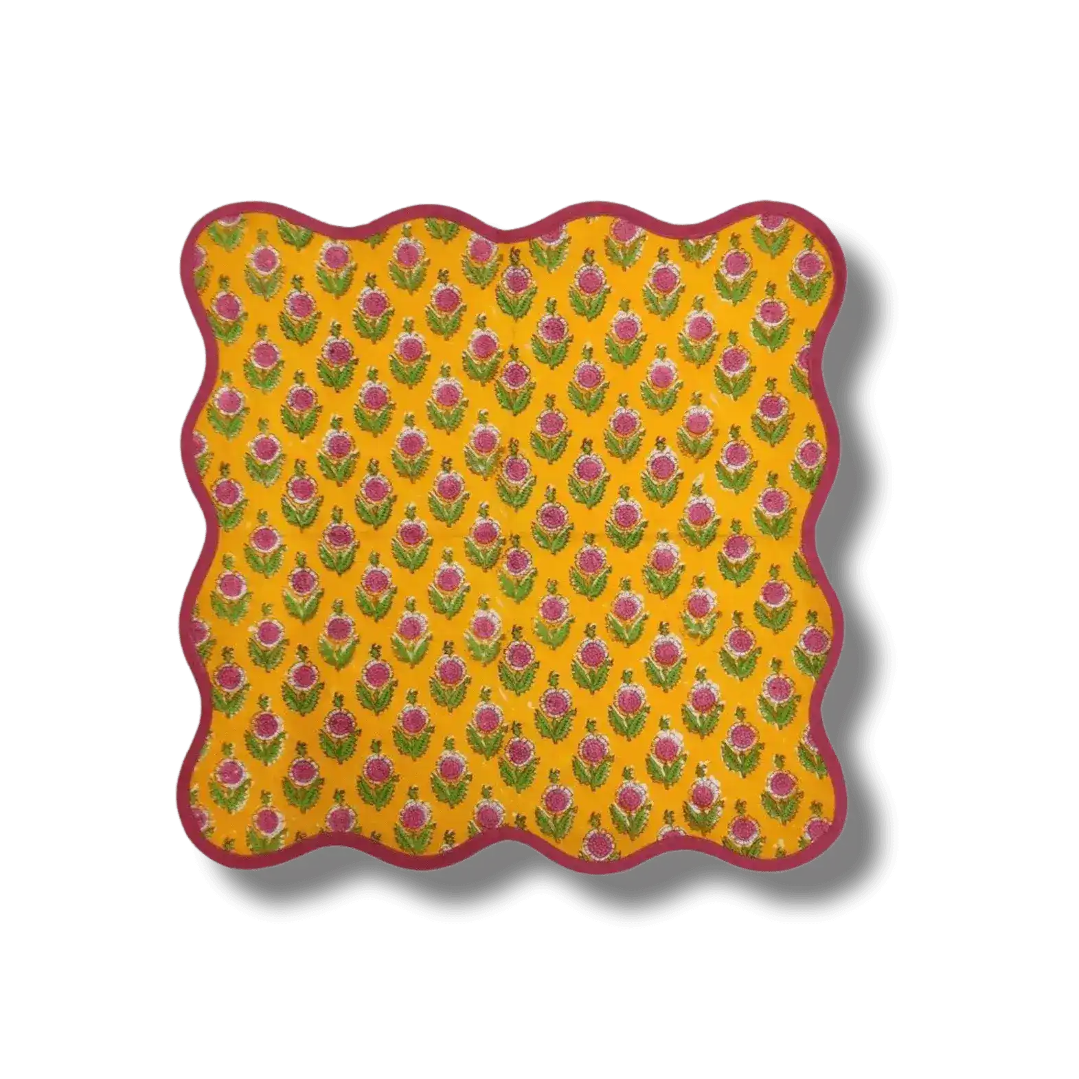 Scalloped Pink Flowers Yellow Block Printed Cotton Napkins