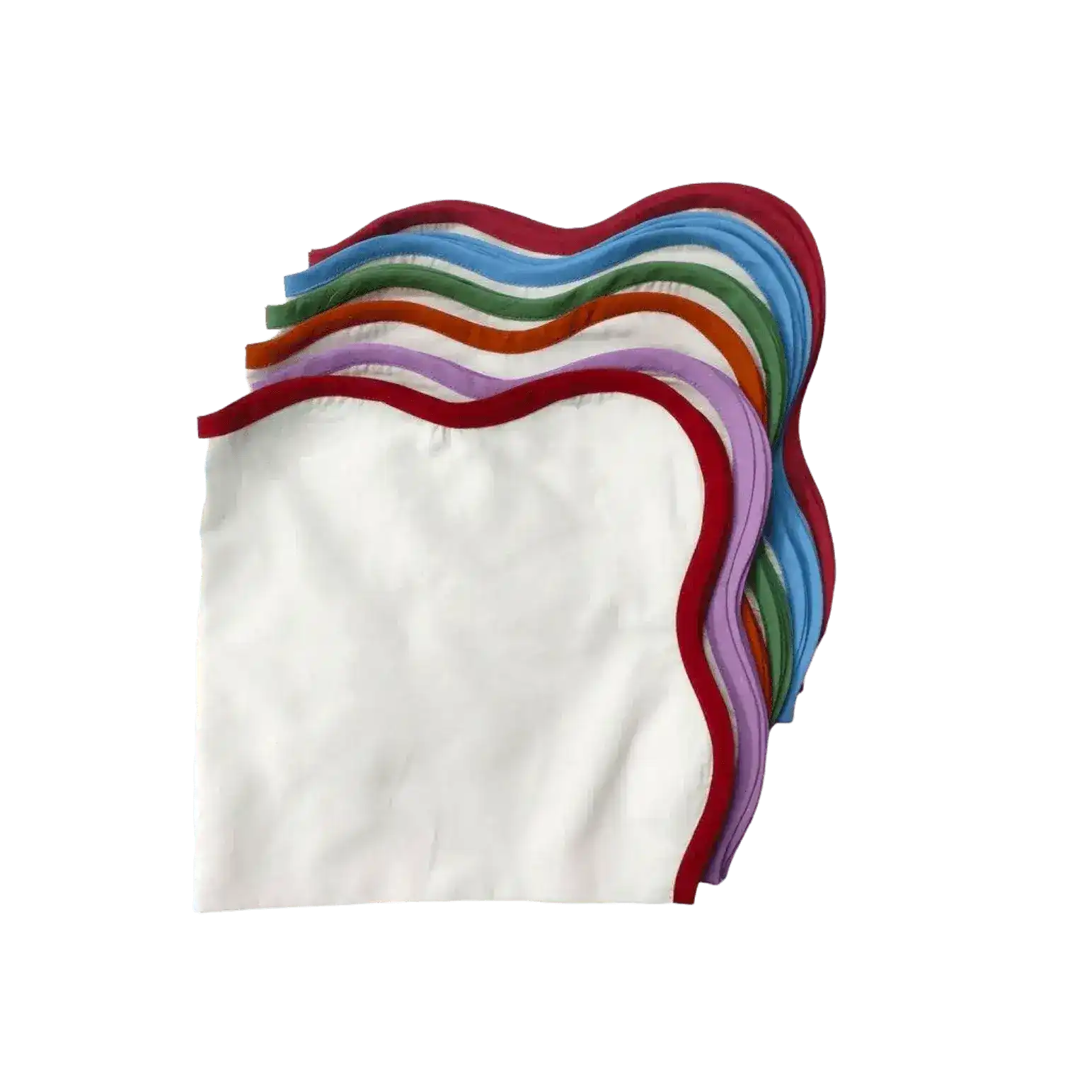 - A garden color delight! Scalloped Plain White Napkins with Colored Trim are cute and colorful featuring green flowers on natural fabric napkins. These are sold in a set of 4 and handmade from 100% cotton fabric. Using reusable cloth napkins of any size is a great way to reduce store-bought paper napkin usage and help our earth, sustainably.