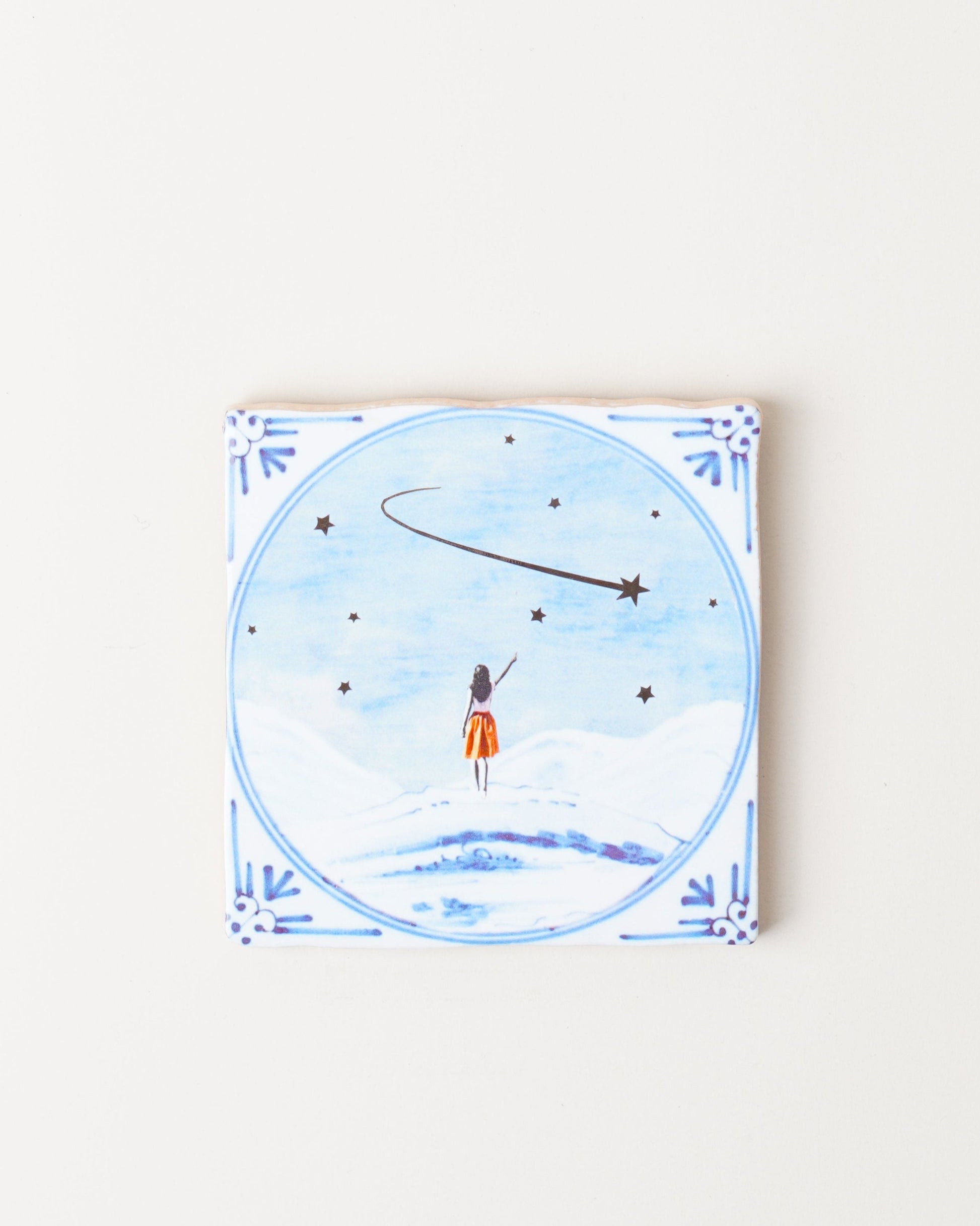 "Make a wish with StoryTiles. Ceramic tiles have been made in and around Delft, The Netherlands, since the 16th century. StoryTiles continues the tradition by creating miniature art-on-tiles. This one captures a young girl wishing upon a shooting star.