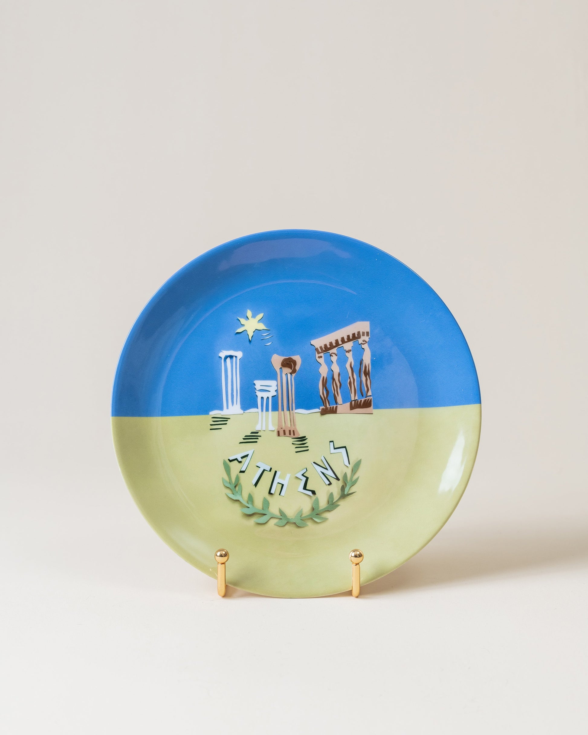 A dessert plate from Tata Naka that's the perfect size for your piece of baklava! With a bright blue half representing the bright blue sky you're guaranteed in the Greek capital with beautiful ancient relics sketched over the top. The only question left is one piece of pudding or two?