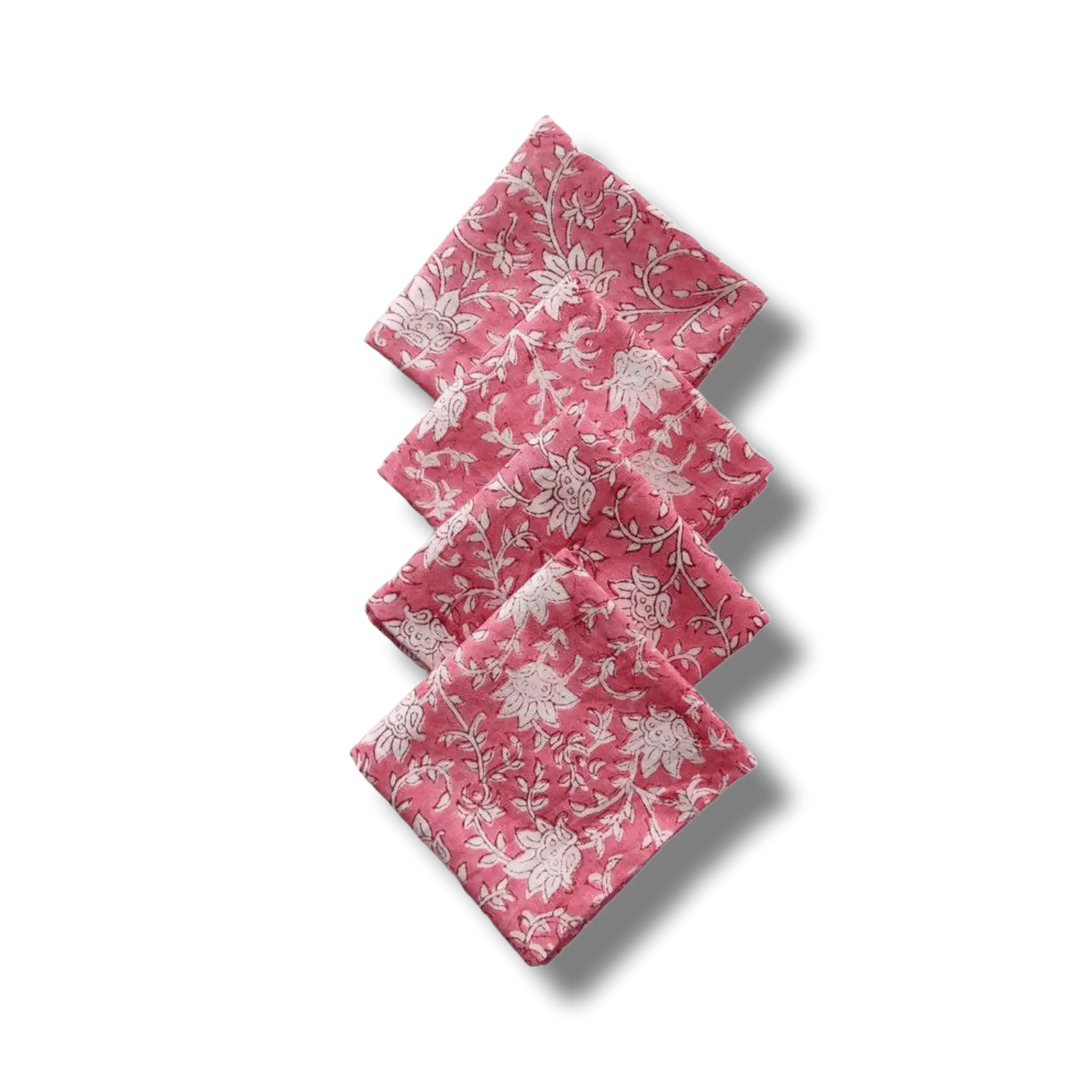 - A garden color delight! White and Pink Floral Block Printed Cotton Napkins are sold in a set of 4 and handmade from 100% cotton fabric. Using reusable cloth napkins of any size is a great way to reduce store-bought paper napkin usage and help our earth, sustainably.